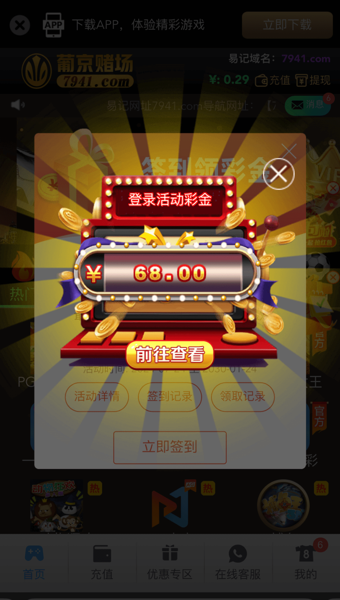 我送了68 以前充值过,不知道能不能到,不要充值就好了 7941.com