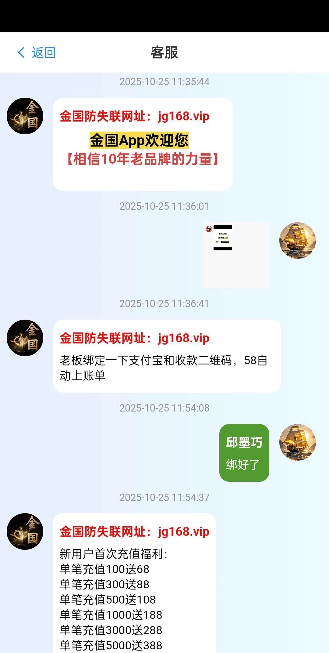 链接jg168.vip下载码8298 ,思语特邀,找客服发了截图,叫我绑支付宝二维码,后自动送了58,我没打出来,要碰的就自己去碰,没问我要思语手机号