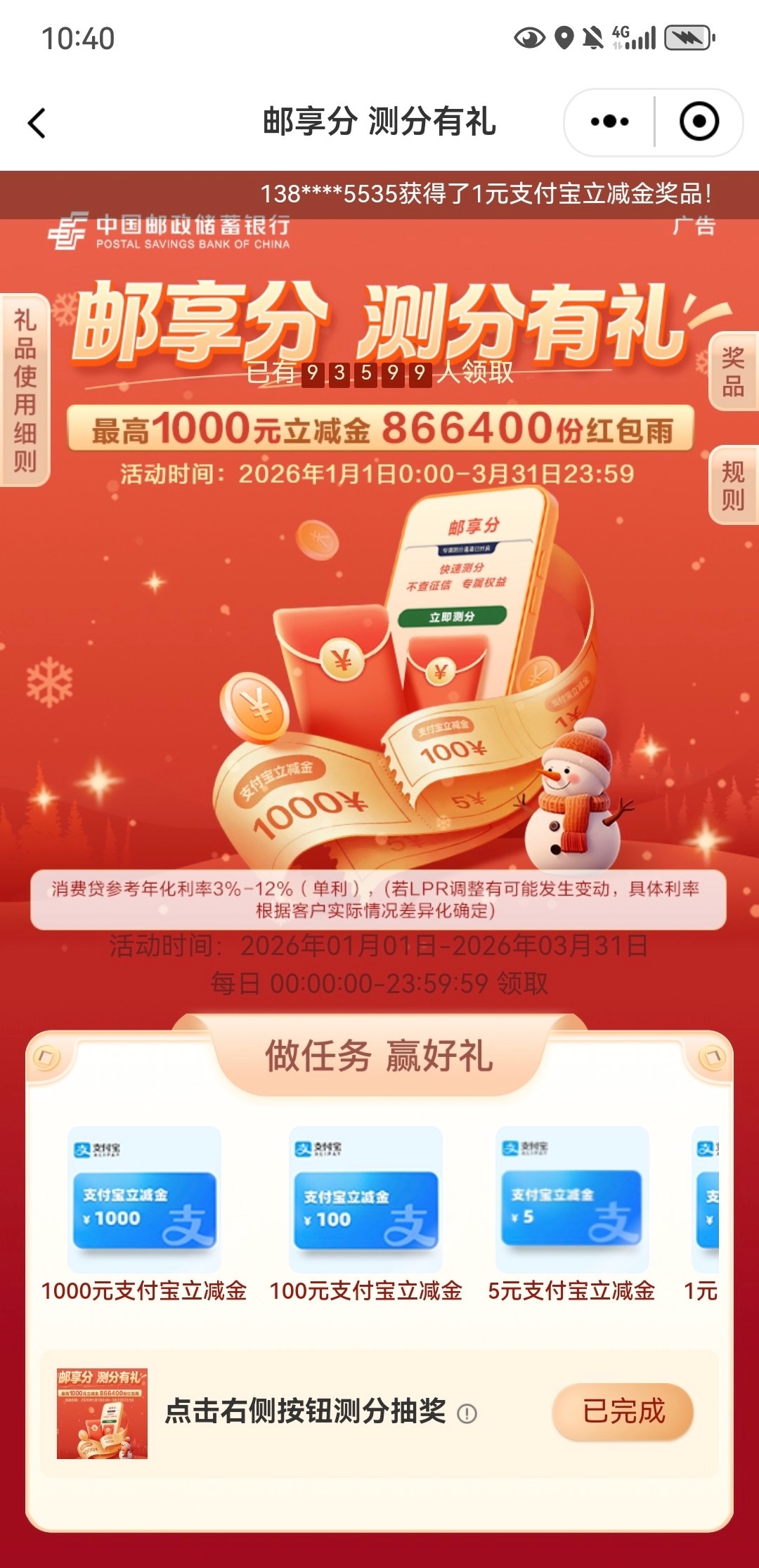【邮储测分/月月有礼抽立减金】