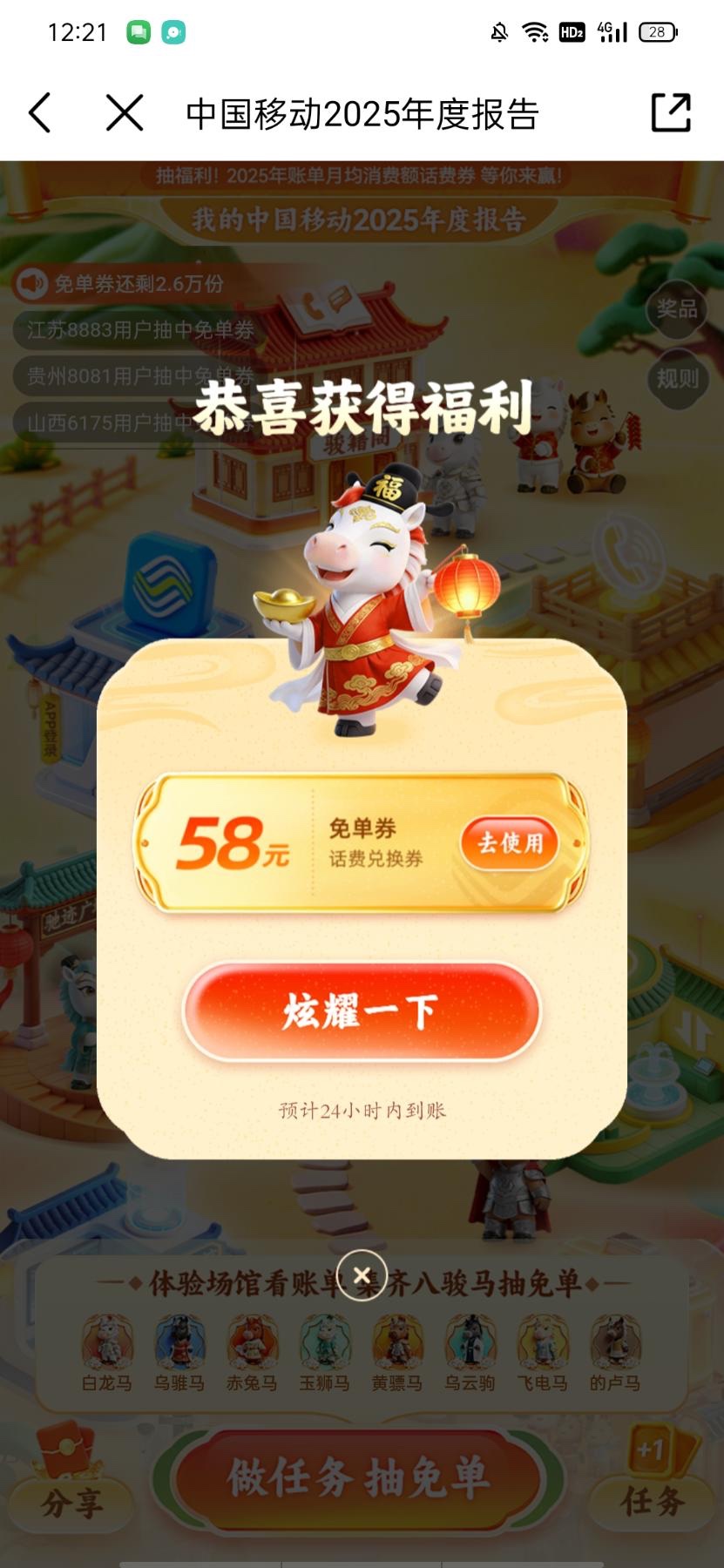 中国移动app,登录搜索年度报告,进去做几个浏览几秒的任务领取抽奖计划,刚刚充值58话费兑换到账。